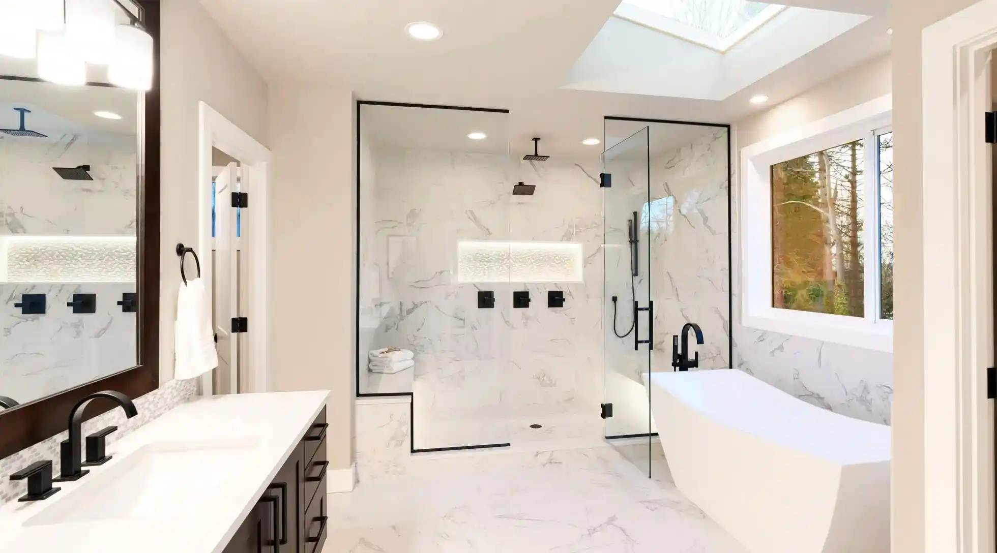 All frames and hardware are made from corrosion-resistant aluminum or stainless steel with finishes such as chrome, matte black, brushed nickel, or gold. Every component is designed to withstand moisture and daily use.